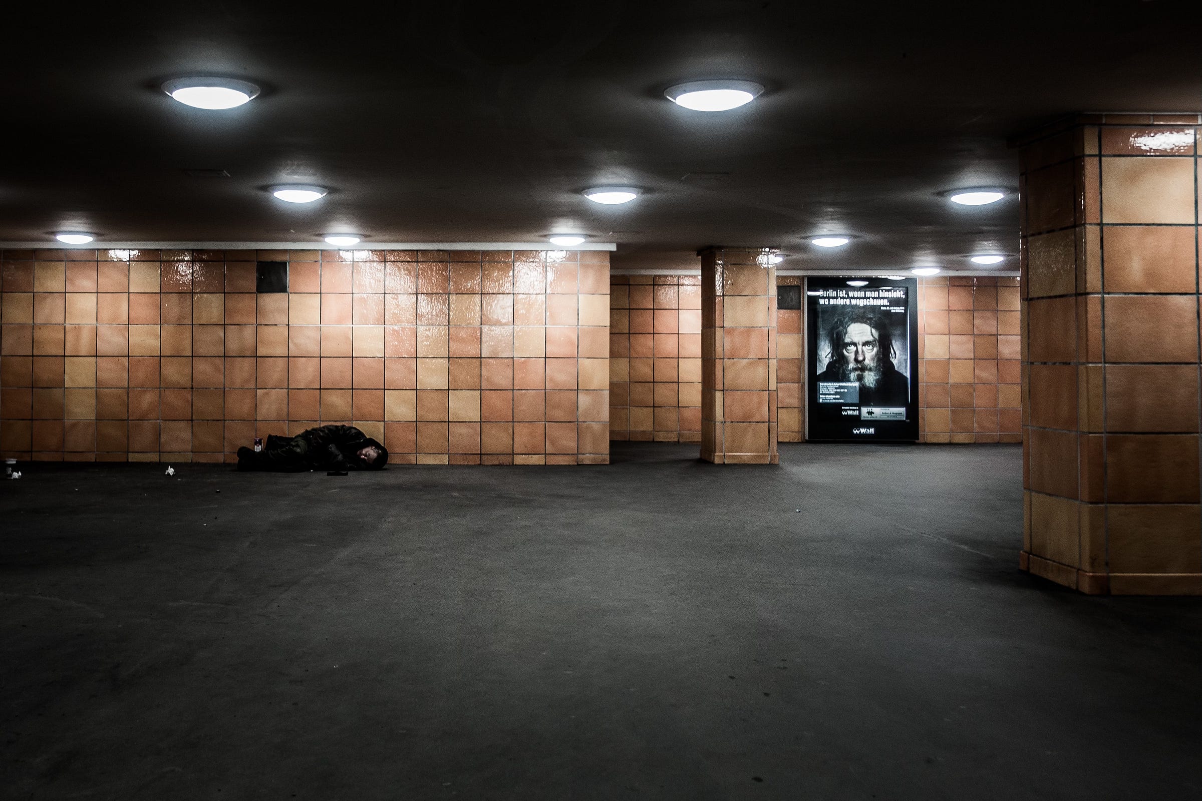 📸 A homeless man lies in a subway station. Next to him is a so-called out-of-home advertisement that says, “Berlin is when you look when others look away.”